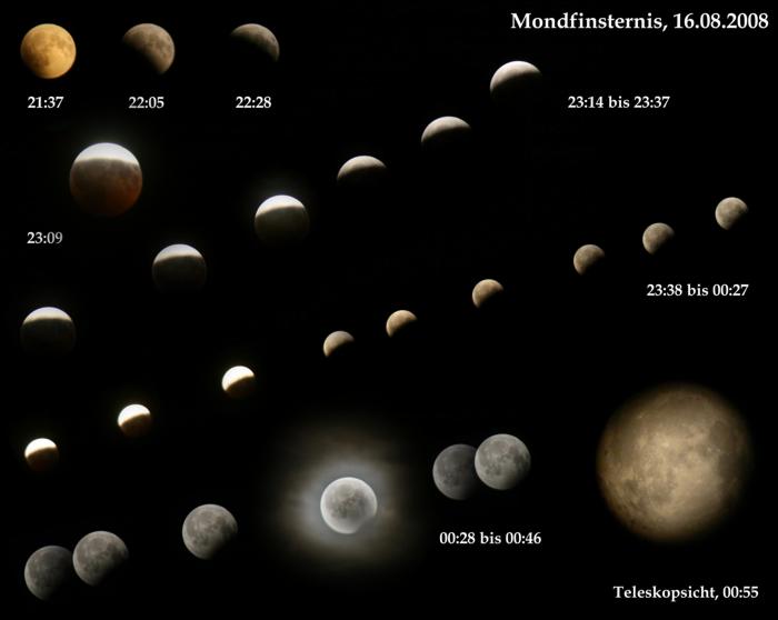 Aus aktuellem Anlass haben wir das Astronomiehalbjahr mit diesem Thema begonnen - die partielle Sonnenfinsternis war zwar schon am 1.08.2008, die (partielle) Mondfinsternis am 16.08.2008 (Samstag) lässt sich aber - so denn das Wetter mitspielt - ca. ab 20:30 Uhr noch beobachten (Eintritt in den Kernschatten ca. 21:30 Uhr).
