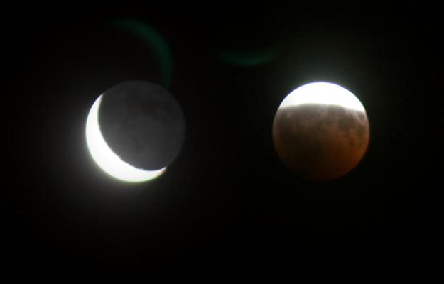 Bei der Mondfinsternis ist die dunkle Fläche schwach rötlich beleuchtet, der Schattenradius ist auch größer als der Radius der beleuchteten Sichel.1)